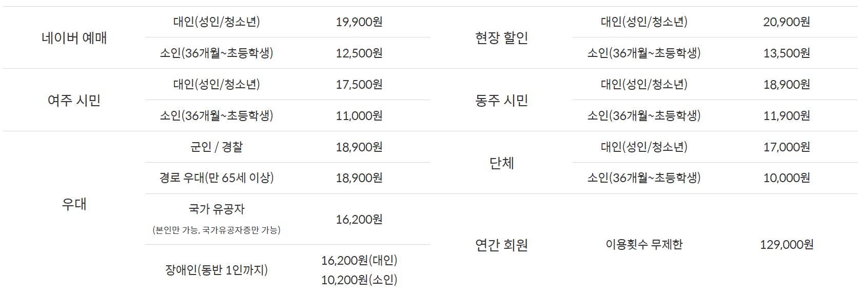 ※할인 항목 중 여주 시민, 동주 시민, 우대, 단체의 경우 매표소 현장 결제 시에만 할인이 적용됩니다.